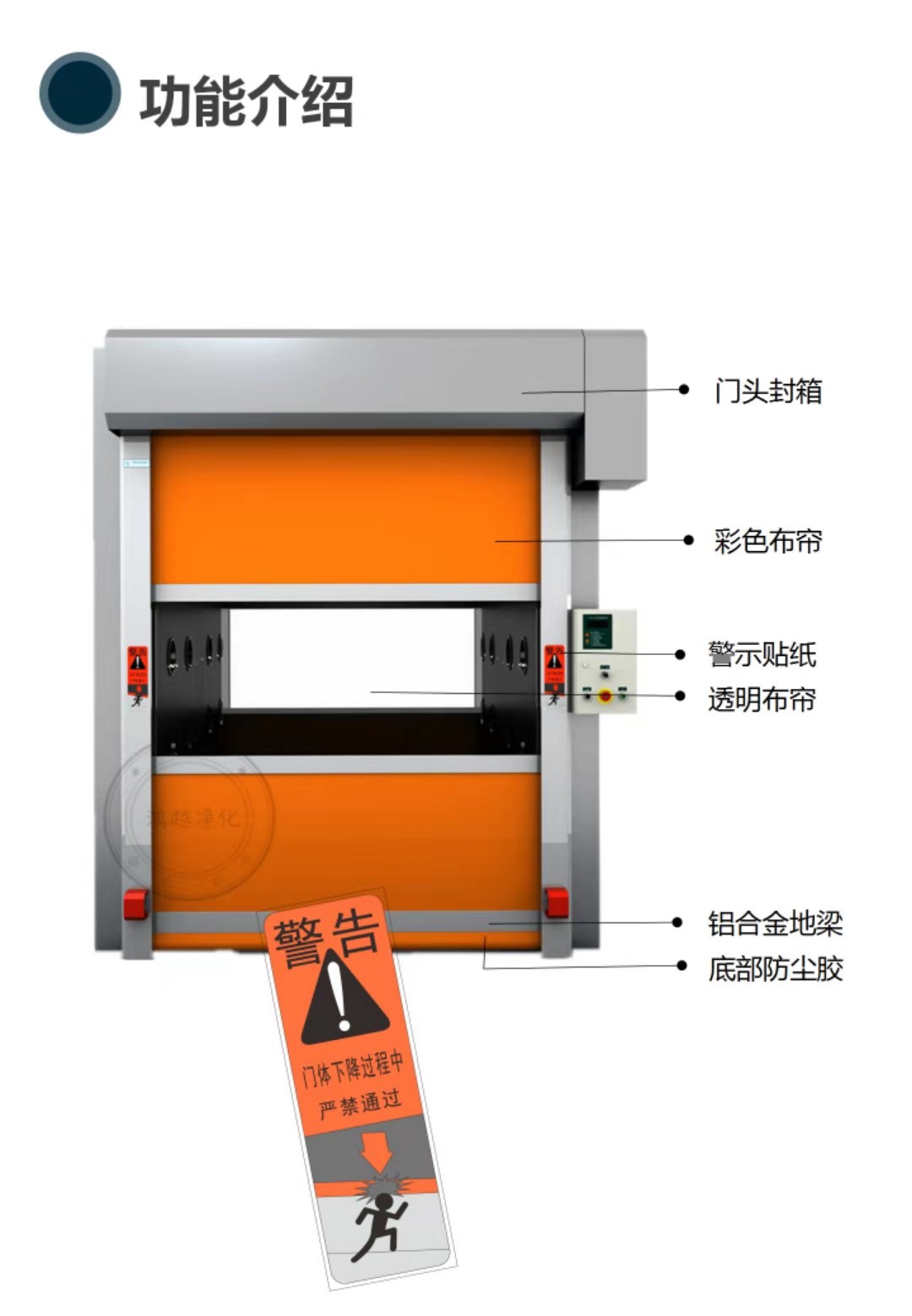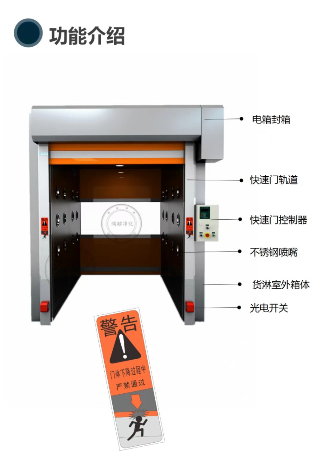 卷簾門貨淋室由風(fēng)淋室大箱體(風(fēng)機(jī)、過濾器安裝于此箱體內(nèi))、小箱體(雙吹風(fēng)淋室此側(cè)安裝噴嘴,數(shù)量與大箱體一致、頂板(安裝內(nèi)嵌式照明燈)、內(nèi)底板(不銹鋼砂板)、風(fēng)淋室雙門體與其它配件:過濾器,風(fēng)機(jī),智能電路板,噴嘴,照明燈、自動(dòng)門裝置、PVC卷簾門、卷簾門電機(jī)、光感、電箱等組成。